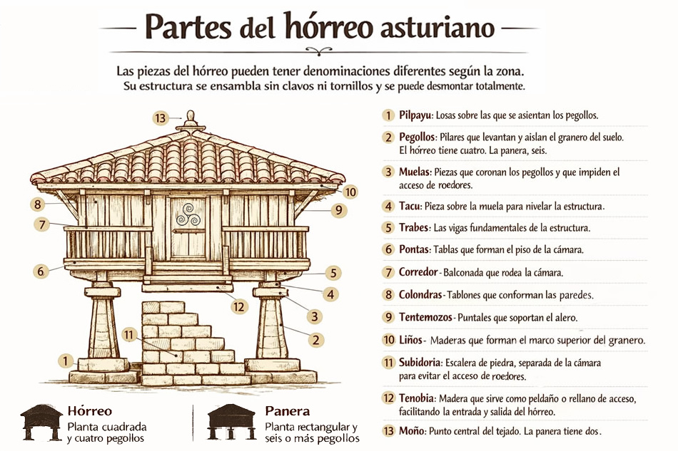 Más allá de las tipologías existentes en la península Ibérica, se encuentran en todo el mundo graneros aéreos sobre pies que son morfológicamente afines al hórreo, como el stabur noruego, el hebre sueco, el sol’ek polaco o el kukuruzniak serbio… En Asturias hay dos tipos de construcciones. El más numeroso de ellos, el hórreo: un edificio de planta cuadrada que está formado por una cámara de madera, muchas veces con corredor, que se sostiene habitualmente sobre cuatro pies, o pegollos de piedra. En La panera suelen ser seis. En cualquier caso, existe una falsa creencia, muy extendida, que tiende a diferenciar un hórreo de una panera contando exclusivamente los pegollos. Los hórreos fueron los primeros en aparecer, eso sí es cierto; existiendo referencias documentadas desde el siglo XIII.