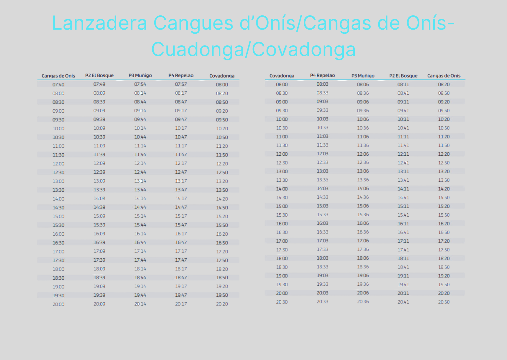 De manera complementaria y mientras que el plan de transporte esté activo, es posible acceder a Cuadonga/Covadonga utilizando el servicio de lanzaderas que salen desde Cangues d’Onís/Cangas de Onís. Con 26 frecuencias diarias operará cada 30 minutos en ambos sentidos, desde las 7:40 hasta las 20:00 horas. ininterrumpidamente. El precio del billete es de 1,55€ y está incluido en la compra del billete de autobús a los Lagos.